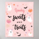Halloween spooky cute pink ghost spooky sweets and treats sign. Modern Halloween-themed design for a spooky party! This birthday sign features spider's webs, ghosts, pumpkins, bats, spiders, leaves, corns, stars and daisies. This sign is great for little girl's birthday parties!