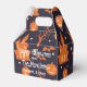 This Halloween pattern features classic and cutely spooky stuff in silhouettes of orange and yellow on a black background. A haunted house surrounded by the moon, trees, bats and pumpkins. Fun and festive favour box for your Halloween party!