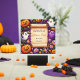 The design features an aged parchment scroll at the centre, providing a blank space for text. Surrounding the scroll are various Halloween-themed icons, including smiling jack-o’-lanterns, ghosts with different expressions, candy corn, Halloween-coloured lollipops, black spiders, and bats. The background is a deep purple with subtle star patterns, creating a playful and spooky atmosphere perfect for a Halloween invitation.