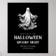 Spooky welcome sign for a Halloween party with a black and white ghost.