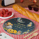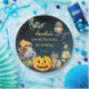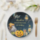 Halloween spooky spooktacular birthday party tableware personalised template plates, Halloween pumpkin, bat, owl, cat, brewing pot starry night sky black background.