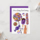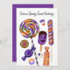 A delicious Halloween Birthday card design featuring illustrations of various Halloween candies including eyeball gumballs, gummies, striped lollipop, and swirly striped hard candy in orange, purple and black colours.