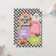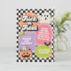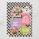 Spooky Vibes halloween birthday invitation with ghost, candy, bats and chequered background.