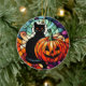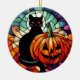 Halloween themed ornament in a faux stained glass style featuring a jack-o-lantern and black cat.