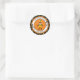 This small size round sticker is shown in a cute festive Halloween pumpkin child print.