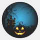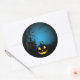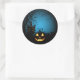 Round shape sticker shown in a haunting Halloween pumpkin scene print.