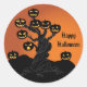 Round shape sticker shown in a Halloween haunted pumpkin tree print. Customise this item or buy as is.