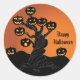 Round shape sticker shown in a Halloween haunted pumpkin tree print. Customise this item or buy as is.