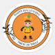 This small size round sticker is shown in a cute festive Halloween pumpkin child print.