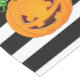 Table runner to accent your table decor is shown in a Black and White stripes print design with a Halloween print.