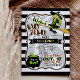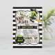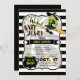 Wicked funny baby shower invite! Cute, lime green, black, grey orange, yellow and white Halloween theme baby shower invitation on black and white stripes pattern. Features green and black witch flying on broom and black pot with witch brew and fun fonts. It's a boy can be changed to girl for baby boy or girl baby showers! Great for October Halloween theme baby showers! Vintage bracket shaped invite.