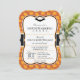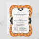 Elegant Halloween theme housewarming party invitation on orange pumpkin pattern pattern. Features a black bat header with spider web and pumpkin pattern. Great invite for October housewarming parties!