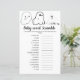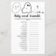 Halloween theme ghost layout , scramble word card for baby shower The words on this card are all related to babies and have been scrambled. The guests will compete to see who can unscramble them all first! ANSWER KEY: 1. LULLABY ; 2. milk 3. MOBILE 4. pacifier The fifth item is a diaper rocking chair. 7. nursery 8. baby monitor; 9. swaddle 10. WIPES. 11. BLANKET 12. stroller. 13. SWADDLE. 14. teether. 15. CRIB.