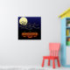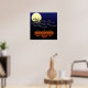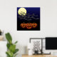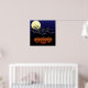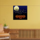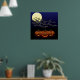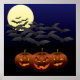 Three Halloween lanterns with flying bats on a moonlit dark background.