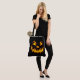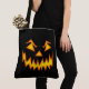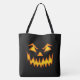 This tote bag is shown with a scary halloween pumpkin face print.