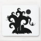Silhouette of a whimsical tree with big-eyed owls sitting on the curly branches with a couple of gravestones visible below. A black silhouetted moon can be seen in the distance.