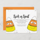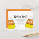A trendy stylish Halloween budget-friendly postcard. With QR code with map and directions icon. Trick or Treat with these cute, funny, and whimsical Halloween candy corn. These adorable little candy corns are happy and ready to add fun to your Halloween festivities. Whimsical orange, yellow and black candy with drawn smiling eyes and smiling faces are cute and can be customised to your liking. This design features Halloween party whimsical cute October, trick or treats candy corn, simple minimalist typography, orange black yellow, October Halloween simple, kids adults family costume Halloween, Halloween birthday party invitation, cute fun funny silly face, Halloween party invites, laura lacina