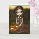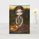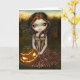 A moody Halloween painting - I've painted this winged beauty at twilight - there is a smoky dusk in the air as the unseen sun is setting. The bare trees give a taste of chill in the air. There's a big lovely Jack O'lantern too, grinning mischievously in the lap of her elaborate striped gown.. My own original acrylic painting.