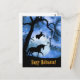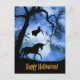 Happy Halloween postcard with a flying witch big full moon, oak tree birds and Unicorn. A mystical magical Halloween holiday postcard.