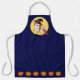 Festive holiday apron for Halloween featuring a Unicorn Pegasus with an orange mane, tail, and hoofs and a candy cor-coloured horn. Unicorn is is wearing a witch's hat with a spider dangling off the end. Yellow full moon and jack o'lanterns.