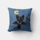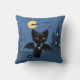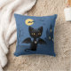 Cute cartoon black cat with bat-like wings. A dead tree, a creepy mansion, some bats, and the moon are seen on the background.