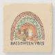 Capture the magic of spooky season with this Halloween Vibes coaster featuring an orange rainbow, a pumpkin-shaped camper van, a friendly ghost, and a smiling jack-o'-lantern. Perfect for fall lovers, Halloween campers, and ghost season enthusiasts.