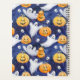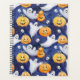 This design features a whimsical and festive Halloween-themed watercolor pattern. The design includes a dark, starry night sky as the background, which sets the stage for a collection of friendly ghosts and cheerful jack-o'-lanterns. The ghosts are painted in soft whites with various cute expressions, floating playfully around the scene. The pumpkins are bright orange, with carved faces ranging from happy to mischievous. Small white skulls are scattered throughout, adding to the Halloween ambiance. The overall pattern is fun and lighthearted, perfect for celebrating the spooky season in a cute and charming way.