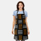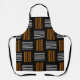 This apron has a mid-century modern design that looks like a weave with orange and white lines on a field of black.