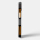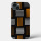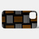 This phone case has a mid-century modern design that looks like a weave with orange and white lines on a field of black.
