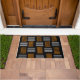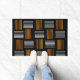 This doormat has a mid-century modern design that looks like a weave with orange and white lines on a field of black.