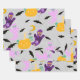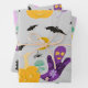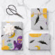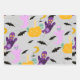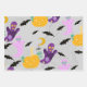 These whimsical Halloween wrapping paper sheets feature non-traditional Halloween colours and ghosts, spiderwebs, mushrooms, bats, and flowers.