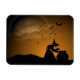 Halloween witch and cauldron amidst a spooky background with orange night sky, moon lit. Bats flying around. www.giftideas505.com