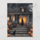A witch stands on the stairs of her creepy haunted house on Halloween. The stairs have pumpkins on them, and there is a black cat.