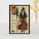 Halloween card with witch holding broom, owl, bats, full moon, and skull and cross bones, and old text in background