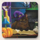 A magical brown chocolate coloured cat wearing a purple witch hart sitting on books. Cauldron, pumpkins, potions, and wand sit amongst the cat.