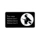 Black silhouette of a Halloween witch flying on a broom in front of the moon. Next to the witch there is a customizable text area for address information, for example.