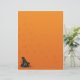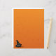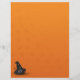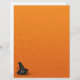 Happy Halloween illustration featuring a witch hat with golden stars and moon and a hanging spider on an orange background with jack-o-lantern pattern shapes.