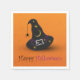 Happy Halloween illustration featuring a witch hat with golden stars and moon and a hanging spider on an orange background with jack-o-lantern pattern shapes.