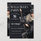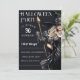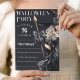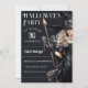 Witch in black costume with black satin bows and a spooky broom on the front and reverse of this Halloween party invitation you can customise. Witch is wearing a black jewelled necklace and is adorned with satin bows for Halloween night. Add all of your party details on the front and there is space provided on the back to add additional information for your guests. Enjoy your party!