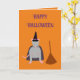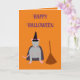 This awesome Halloween card features a digital art image of a cute grey rat witch with pink ears, nose, feet and tail. The rat is wearing a black pointed hat with a gold buckle and purple stars all over it. The rats is also wearing a black cloak also covered in purple stars. Next to the rat is a brown broom made of twigs. This rat is dressed up ready for a Halloween party. There is custom text on the front and inside allowing you to fully personalise the design.