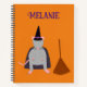 This awesome spiral notebook features a digital art image of a cute grey rat witch with pink ears, nose, feet and tail. The rat is wearing a black pointed hat with a gold buckle and purple stars all over it. The rats is also wearing a black cloak also covered in purple stars. Next to the rat is a brown broom made of twigs. This rat is dressed up ready for a Halloween party. There is custom text so you can include a name.