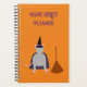 This awesome planner features a digital art image of a cute grey rat witch with pink ears, nose, feet and tail. The rat is wearing a black pointed hat with a gold buckle and purple stars all over it. The rats is also wearing a black cloak also covered in purple stars. Next to the rat is a brown broom made of twigs. This rat is dressed up ready for a Halloween party. There is custom text so you can include a message.