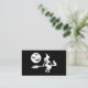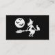 Small business thank you for your order card design featuring Destei's minimalist Halloween silhouette design of a long hair witch woman flying on a broomstick. The witch is wearing a long dress, high heel shoes and a witch's hat. The moon is shining behind the witch and there are three bats flying over it. A cat sits on the front of the broomstick. On the other side there are multiple personalizable text areas.