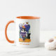 A witch all dressed up in purple and oranges with sugar skull day of the dead make-up on, Black cat, pumpkins, cauldron and full moon.