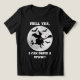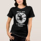 Women's Halloween T-shirt with a silhouette of a witch on a broomstick against the full moon. She is holding a glass of wine that is spilling as a black cat holds on for dear life at the back of the broom. As bats fly around, the caption reads, "Hell yes, I can drive a stick."