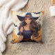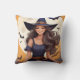 Throw pillow with a cheerful young witch with long flowing hair riding a broomstick in front of a large, glowing full moon. Bats fly around her, adding to the enchanting nighttime scene.