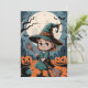 This design captures the essence of Halloween with a witch holding a broom, standing in a cemetery. The witch's face is obscured to preserve anonymity. Behind her, a full moon illuminates the night sky, casting an eerie glow on the tombstones and bare trees. Two carved pumpkins add to the spooky atmosphere, one with a traditional jack-o'-lantern face and the other with a spider web design. Bats fly in the air, completing this typical Halloween scene.