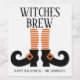 A modern wine labels featuring witch shoes, stocking and "witches brew" in fun font.