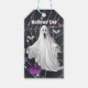 Halloween mood with ghost, bats, purple pumpkin, spiderweb.