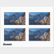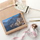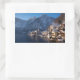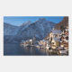 Rectangular photo sticker of the town of Hallstatt covered in snow at the lakeside of the Hallstätter See lake with Alps mountains in the background in the first light of the sunrise in a winter landscape in Austria.